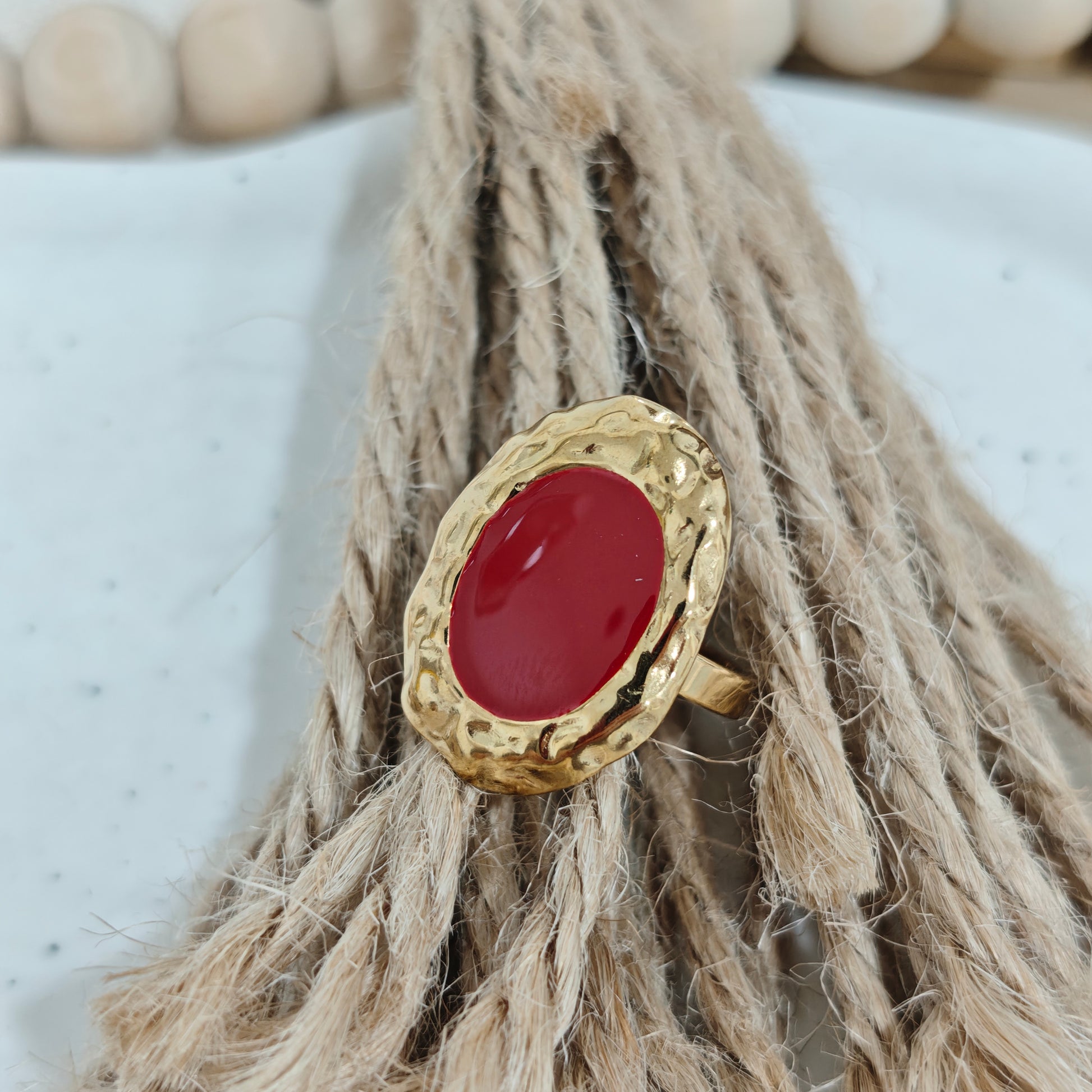El Anillo Aura Rubí Dorado es una joya que transmite fuerza, pasión y seguridad. Su piedra central en tono rojo intenso aporta carácter y magnetismo, mientras que el marco dorado con acabado orgánico y martelé le da ese toque artesanal y boho tan especial.
