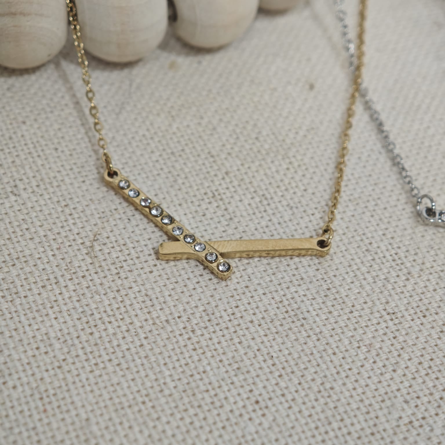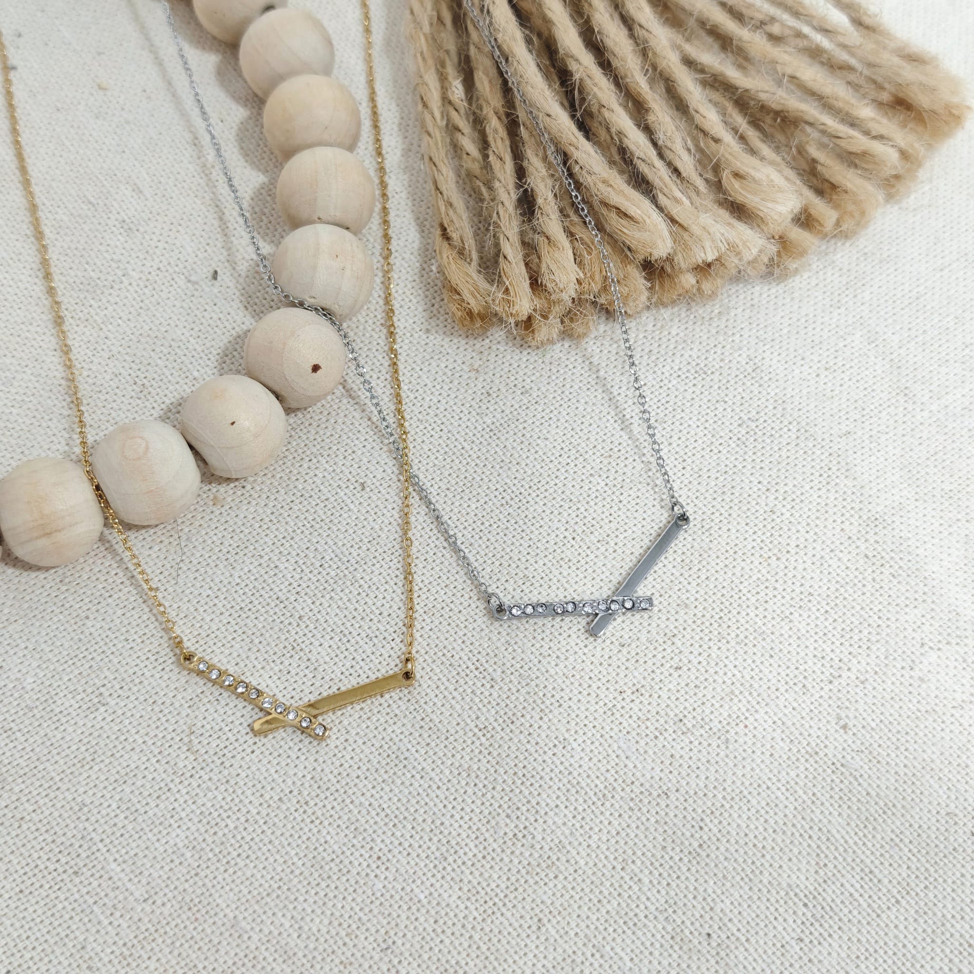 El Collar Cruz Luminosa es una joya delicada y moderna que destaca por su diseño minimal con dos barras cruzadas, una de ellas decorada con pequeñas circonitas brillantes que aportan un toque sutil de luz.