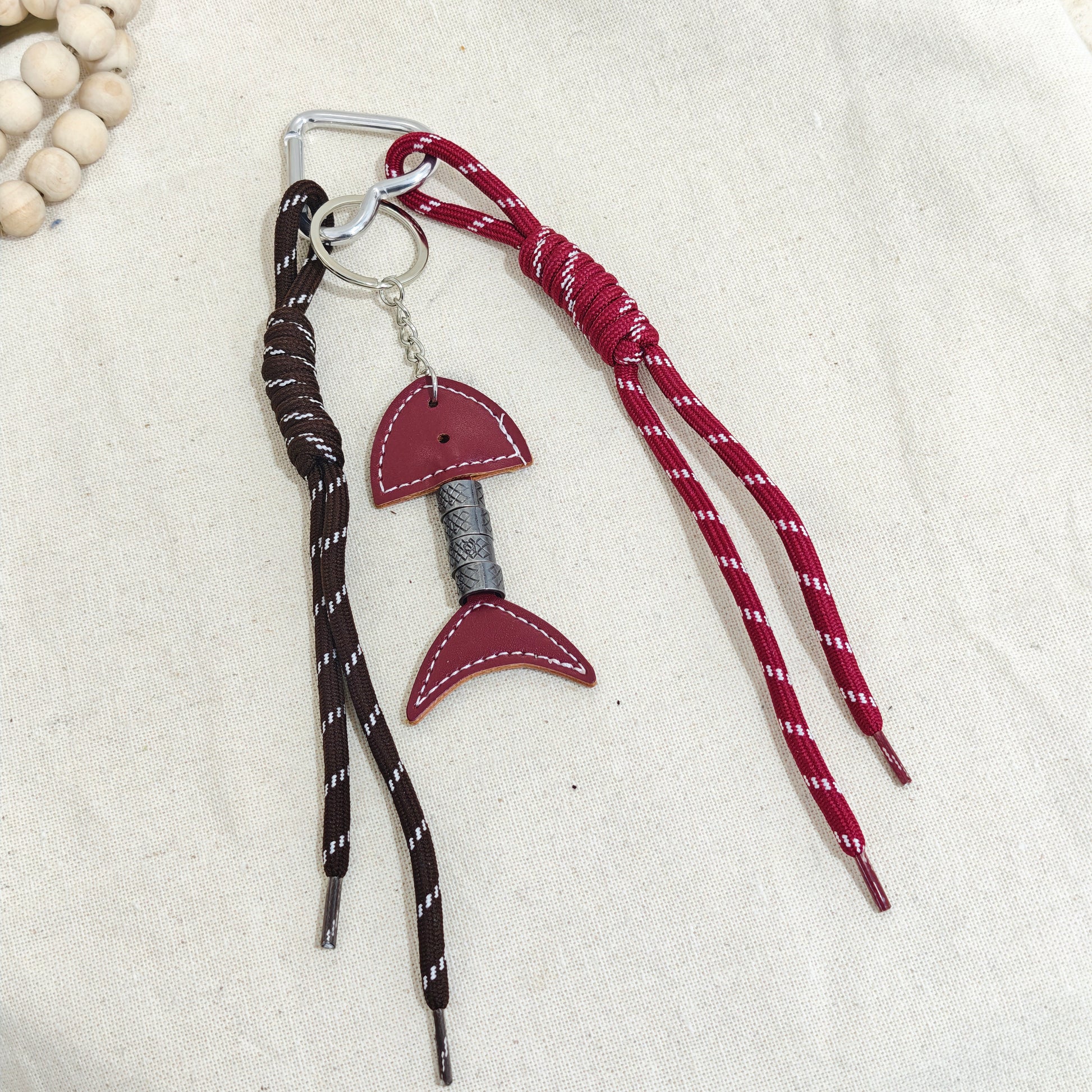 Llaveros originales con diseño de pez, elaborados con cuerda resistente y detalles en polipiel con costura vista. Cada modelo combina dos tonos de cuerda y un mosquetón metálico que permite engancharlo fácilmente en bolsos, mochilas o llaves.