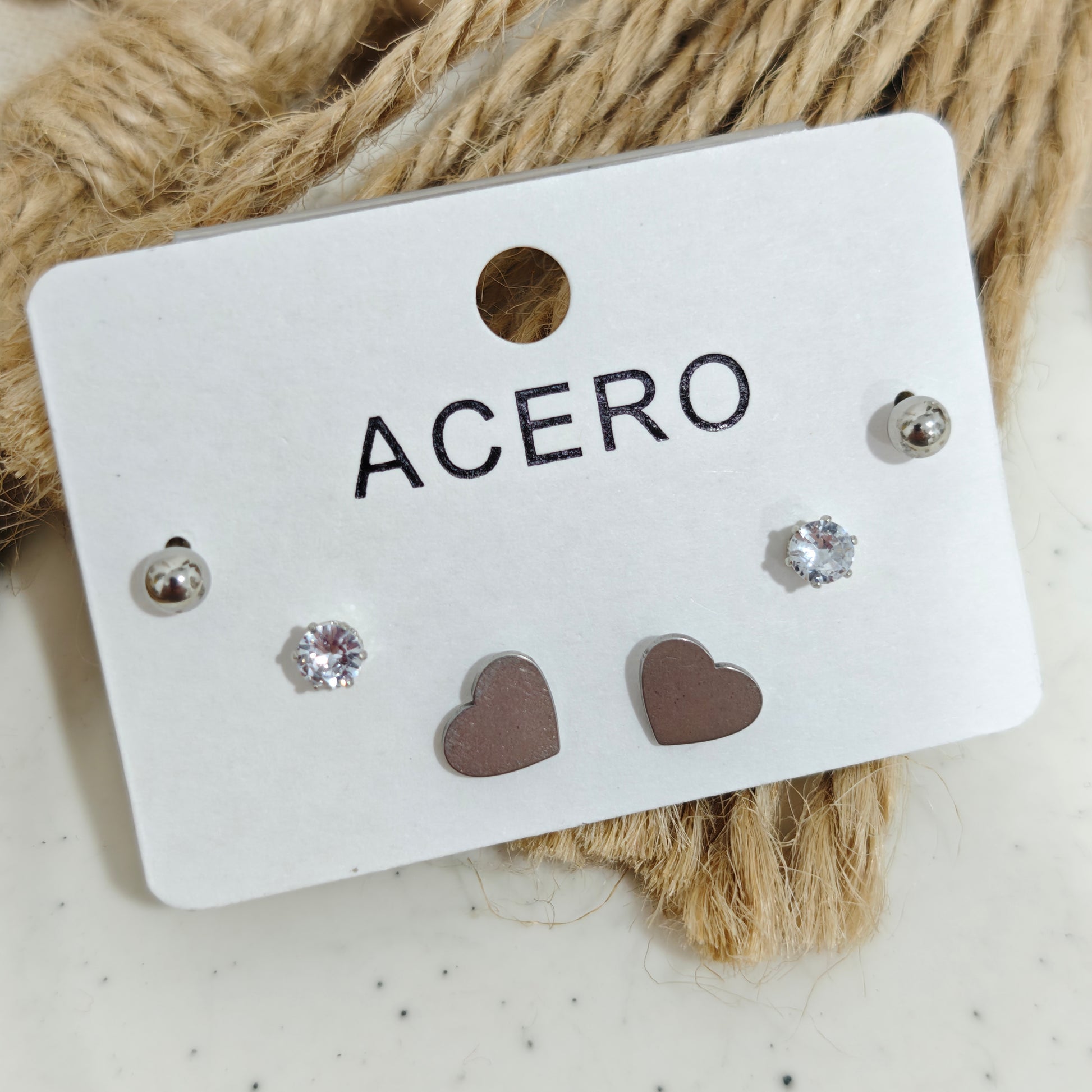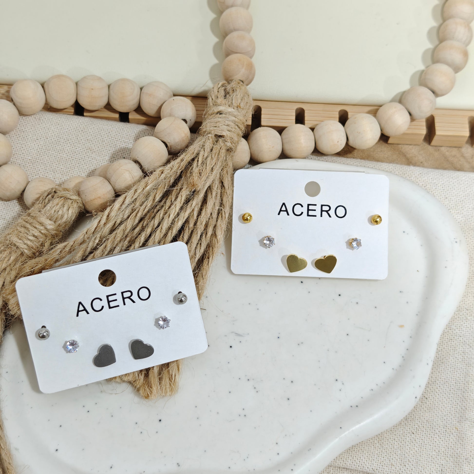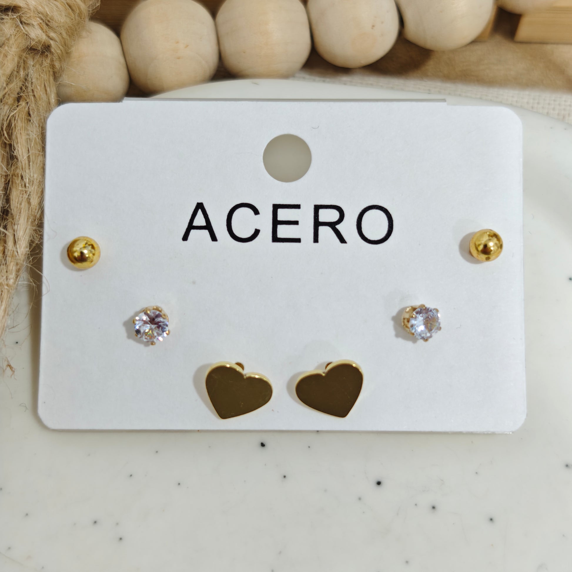 El Pack Esenciales Love incluye tres pares de pendientes diseñados para el día a día: un mini stud clásico, una circonita brillante y un delicado corazón.