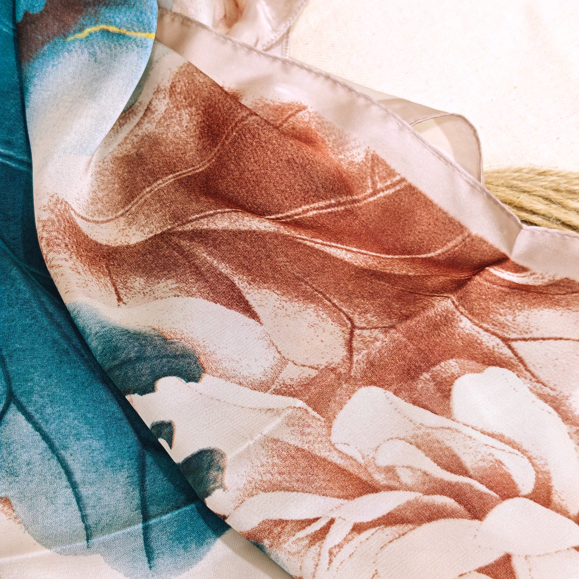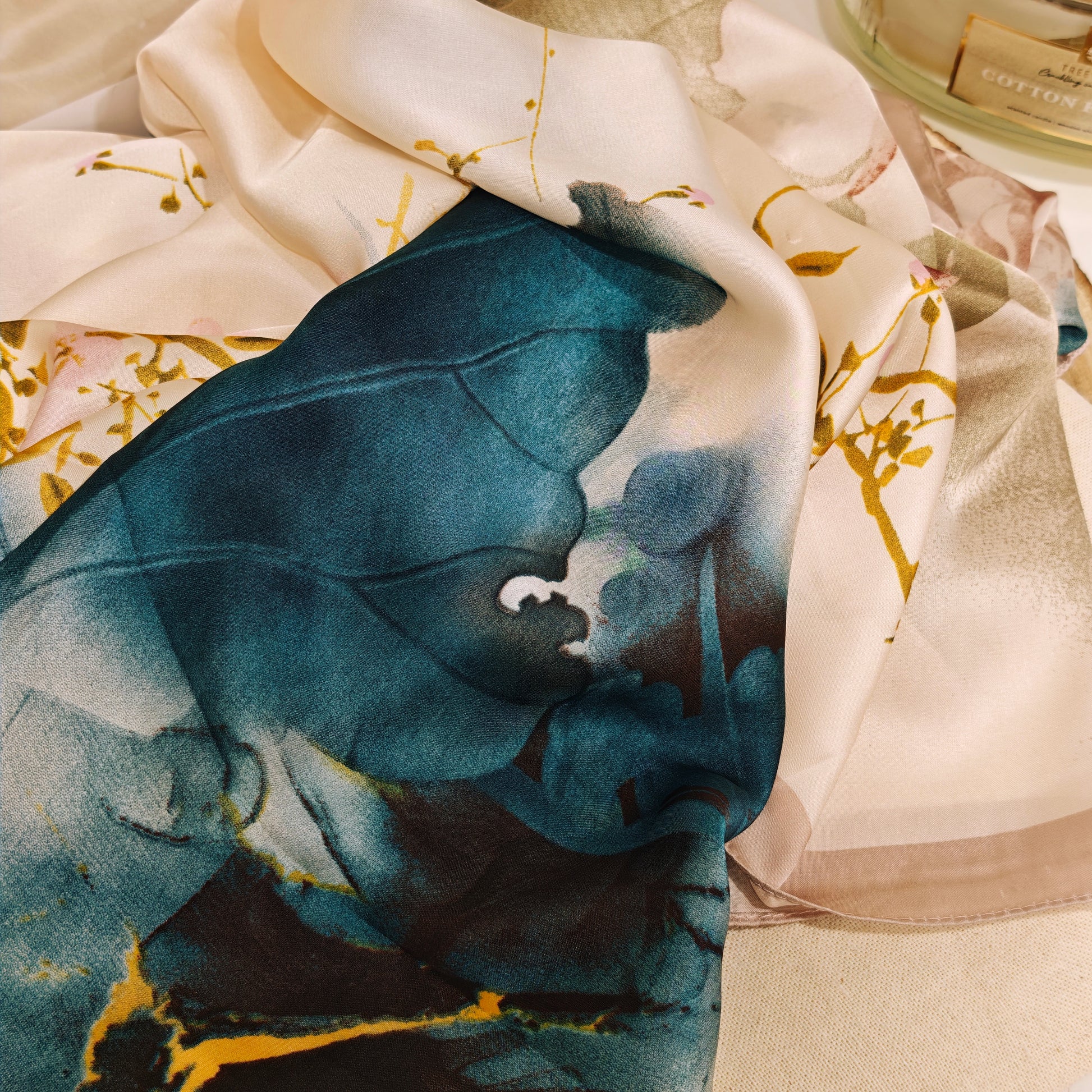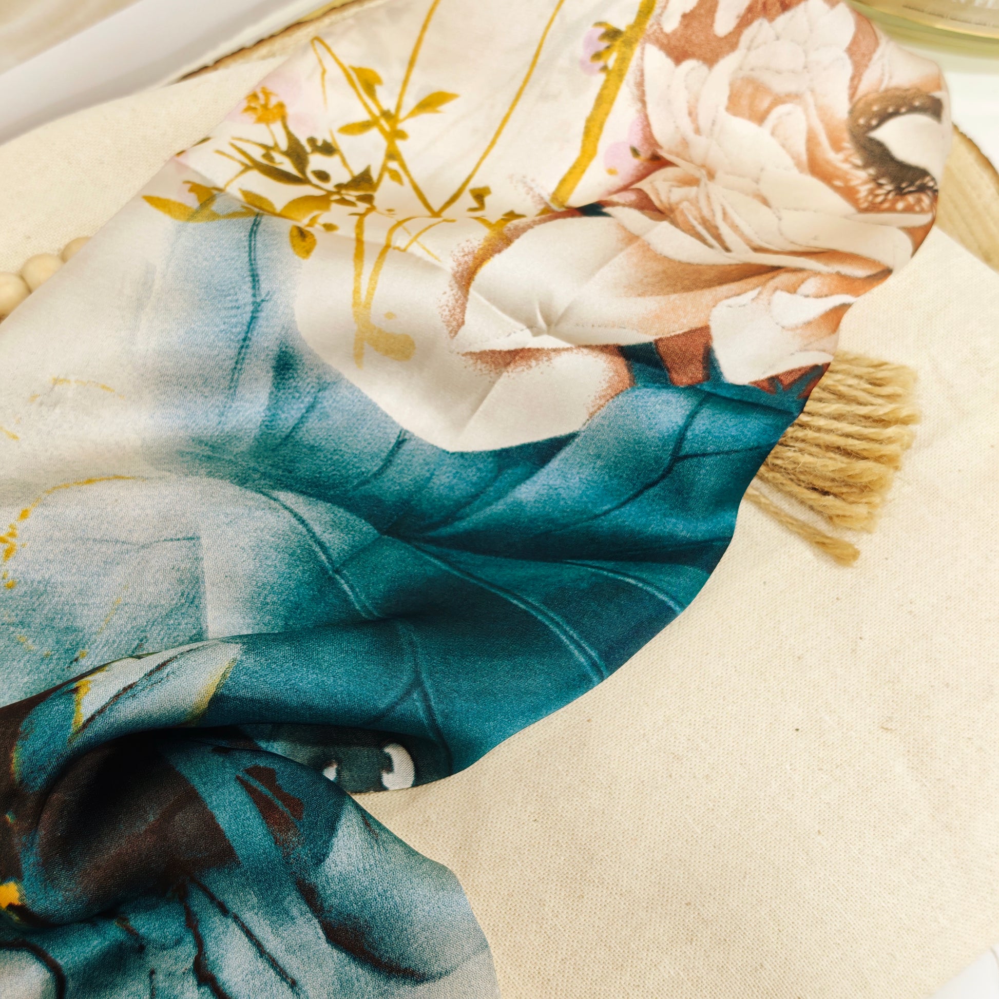 Suave, luminoso y con alma artística. Este pañuelo satinado de 90x90 cm combina tonos tierra, azul profundo y toques dorados en un estampado floral que parece pintado a mano. Ideal para llevar al cuello, en el pelo o incluso en el asa de tu bolso. Aporta ese toque de elegancia natural que transforma cualquier look.