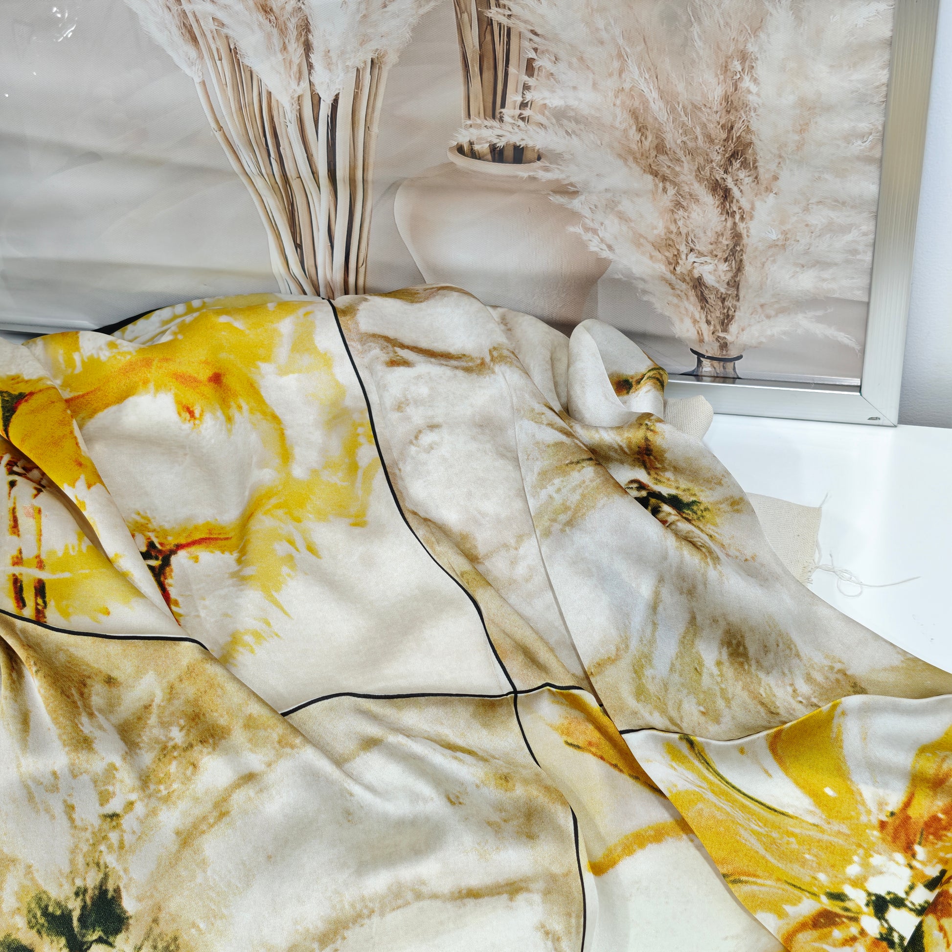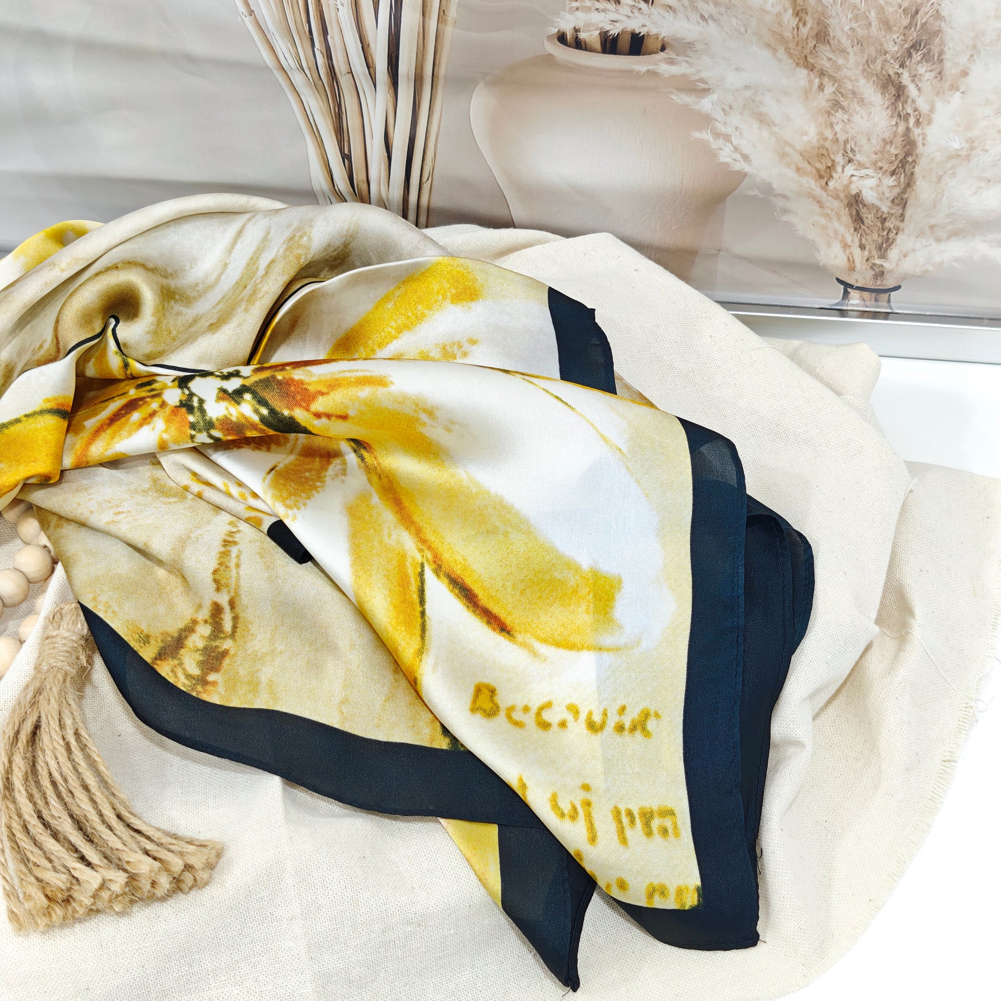 Un accesorio sofisticado y versátil que dará un toque de luz y elegancia a cualquier look. Su tejido satinado suave acaricia la piel con ligereza, mientras que su estampado en tonos amarillos y beige, combinado con un elegante borde negro, lo convierte en la pieza perfecta para resaltar tanto en ocasiones especiales como en el día a día.