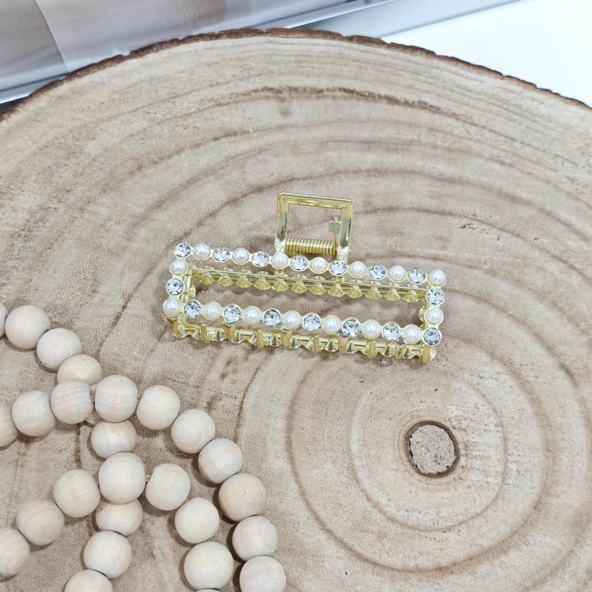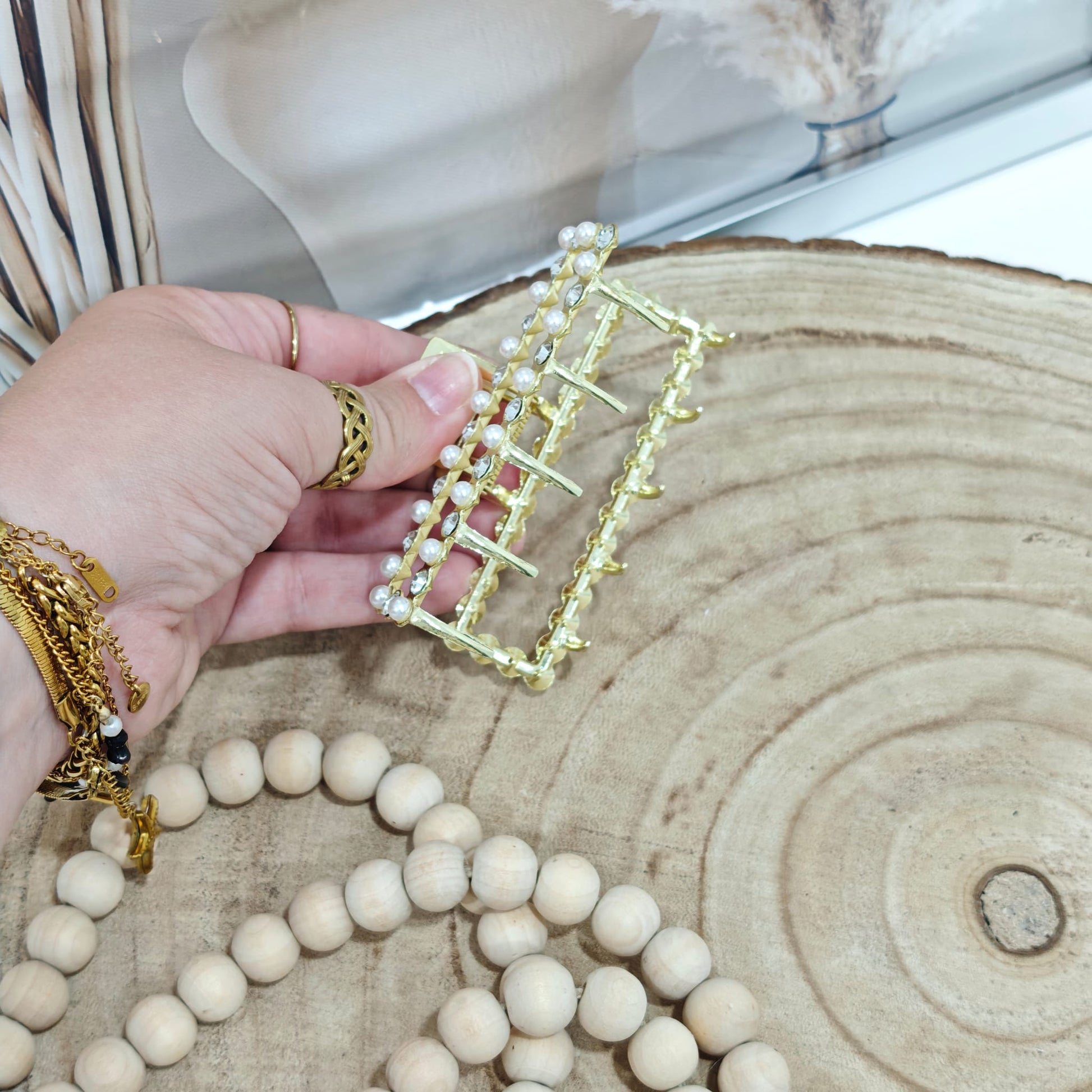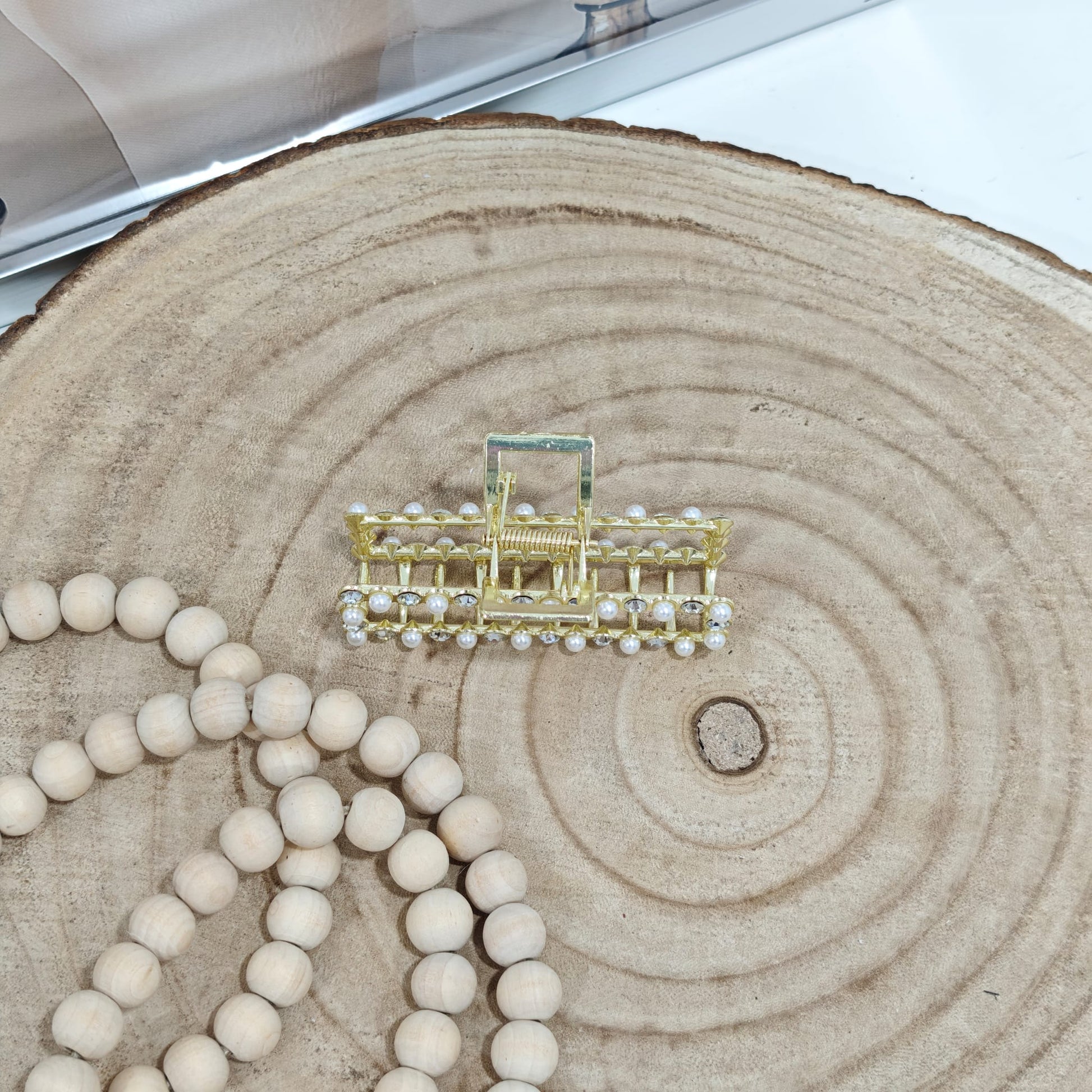 Pinza de material metálico ligero de muy buena calidad. Es de color dorado con perlitas y circunitas que hace que sea muy elegante.