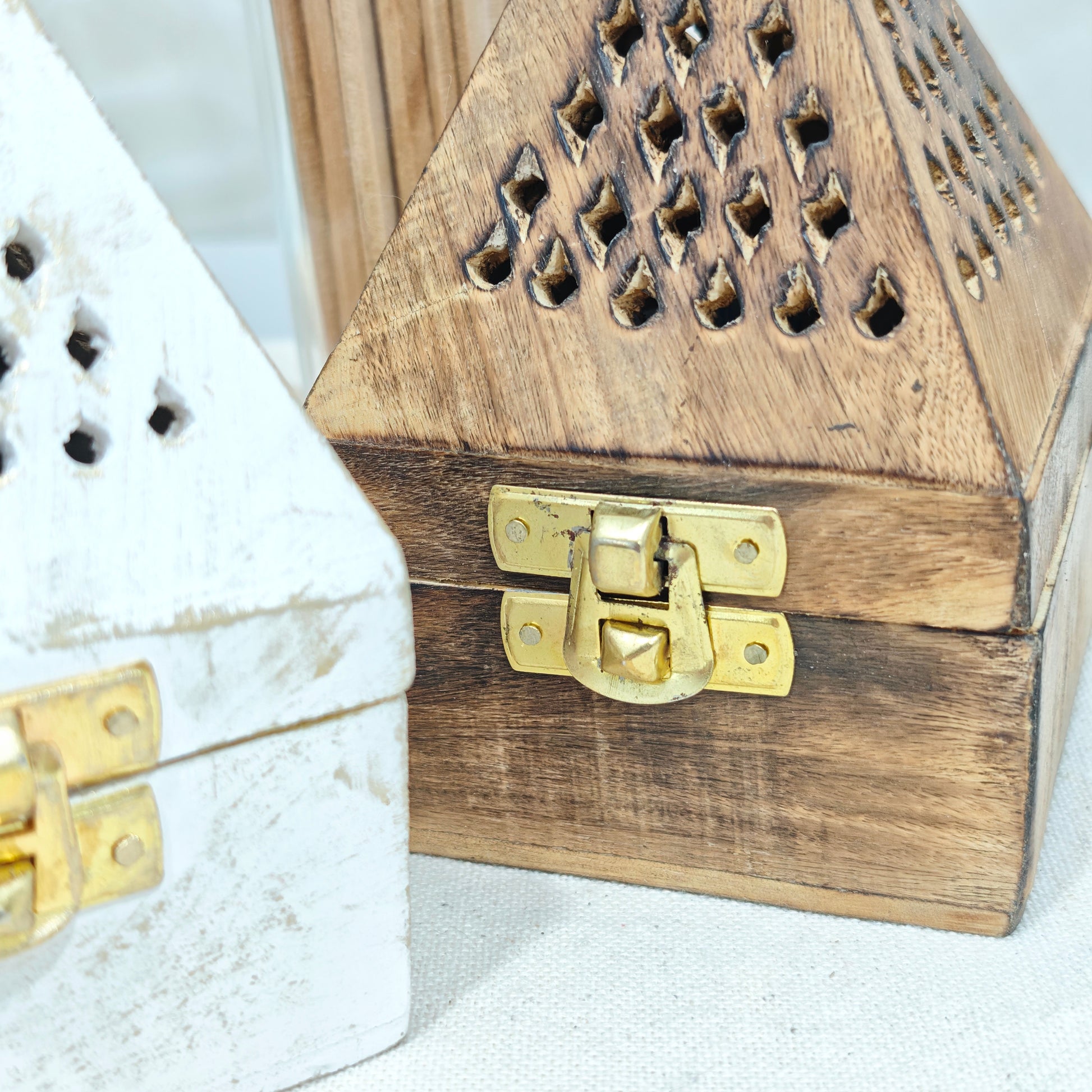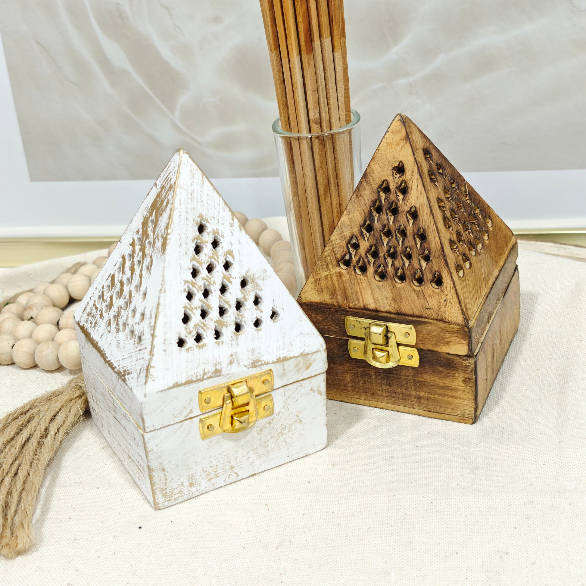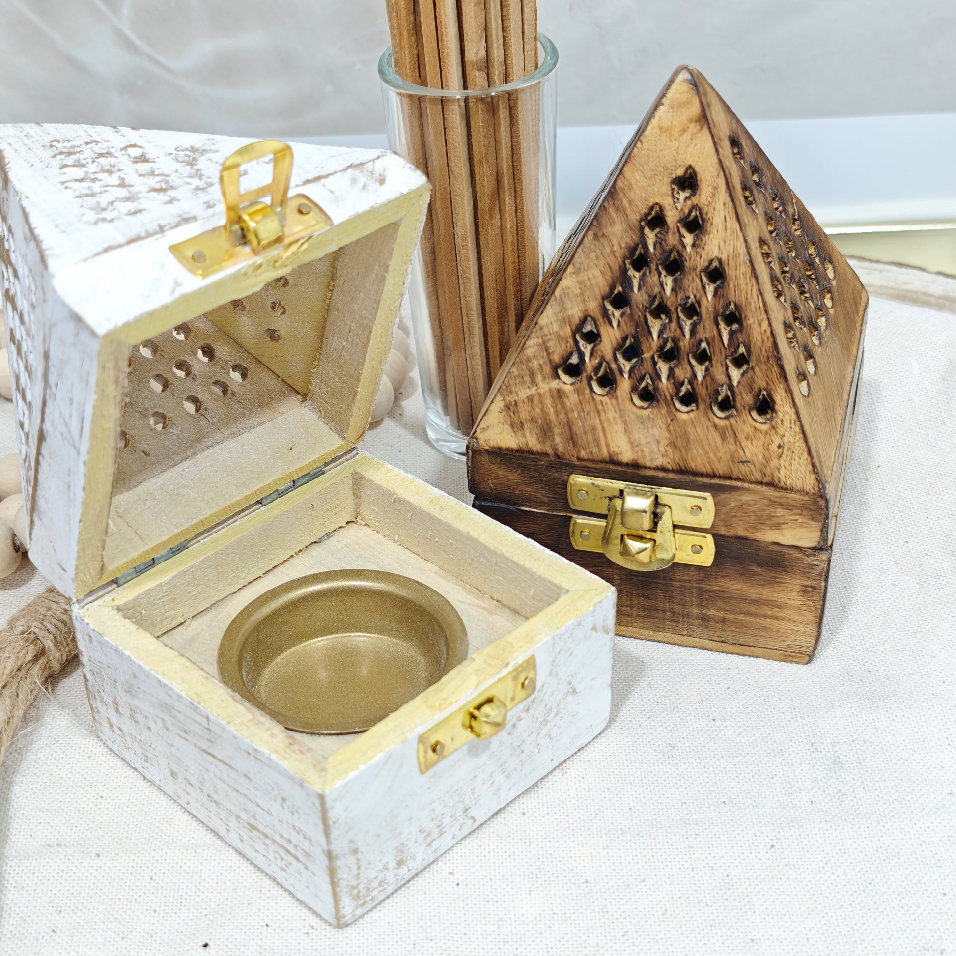 Elegantes pirámides artesanales de madera natural, diseñadas para encender incienso de forma segura y decorativa. Su estructura permite que el humo se libere suavemente por los orificios superiores, creando un ambiente relajante y armonioso. Cada pieza cuenta con un pequeño cuenco interior para colocar conos o resinas. Perfectas para quienes disfrutan de los rituales de bienestar y buscan un toque boho y cálido en su hogar.