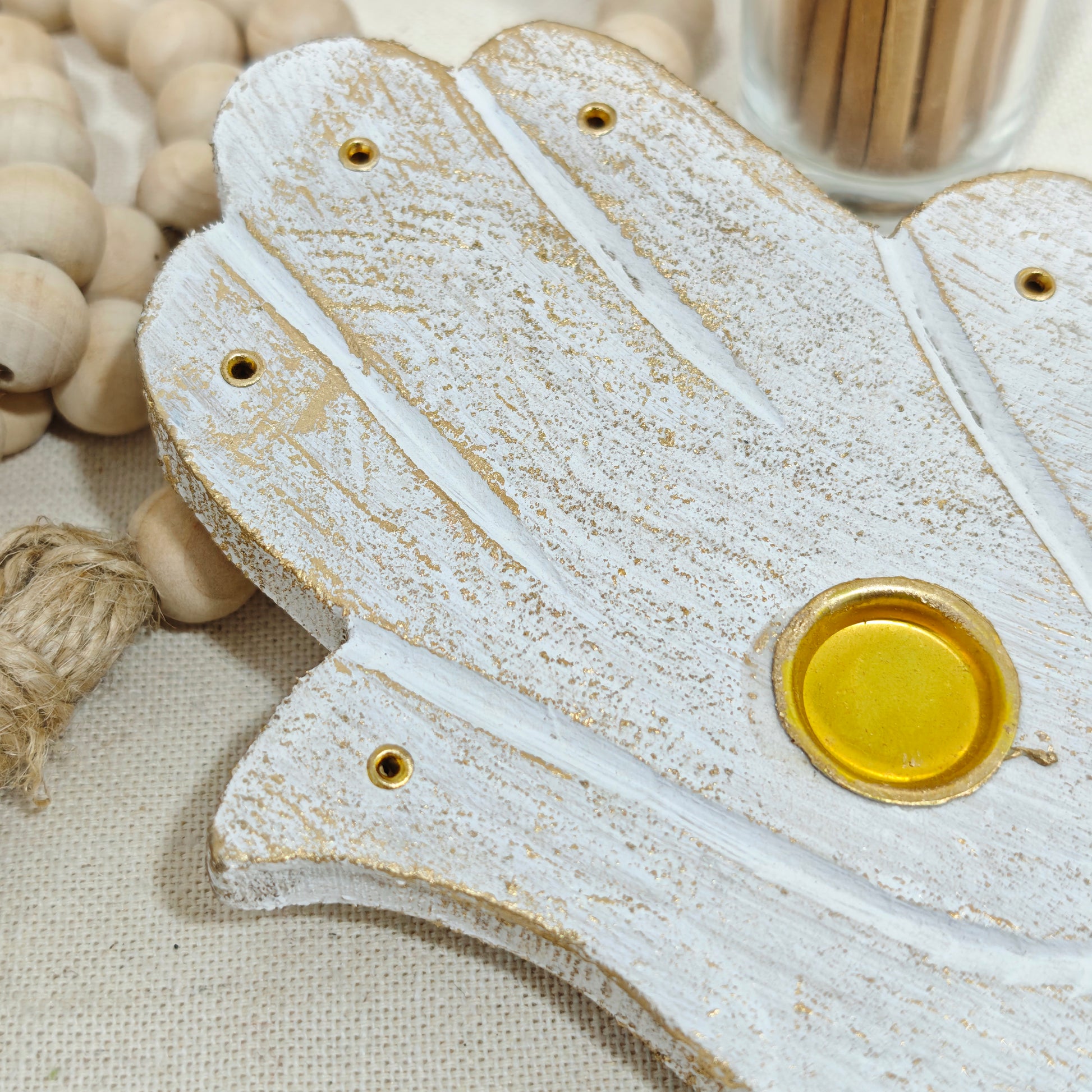 Base artesanal en forma de Mano de Fátima, símbolo de protección y energía positiva. Su acabado en blanco envejecido con toques dorados aporta un estilo boho y elegante. Cuenta con cinco orificios para varillas de incienso y un soporte central para conos, permitiendo disfrutar de varios aromas a la vez. Una pieza decorativa y espiritual que embellece cualquier rincón mientras perfuma el ambiente con armonía.