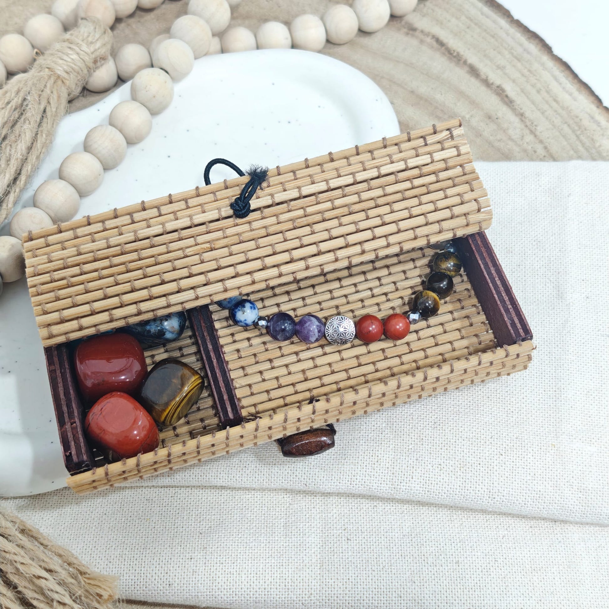 Incluye un cofre de bambú natural, perfecto para guardarla, cargarla energéticamente o convertirla en un regalo lleno de intención y significado. Cada piedra aporta su energía única, creando una pulsera tan bonita como poderosa.