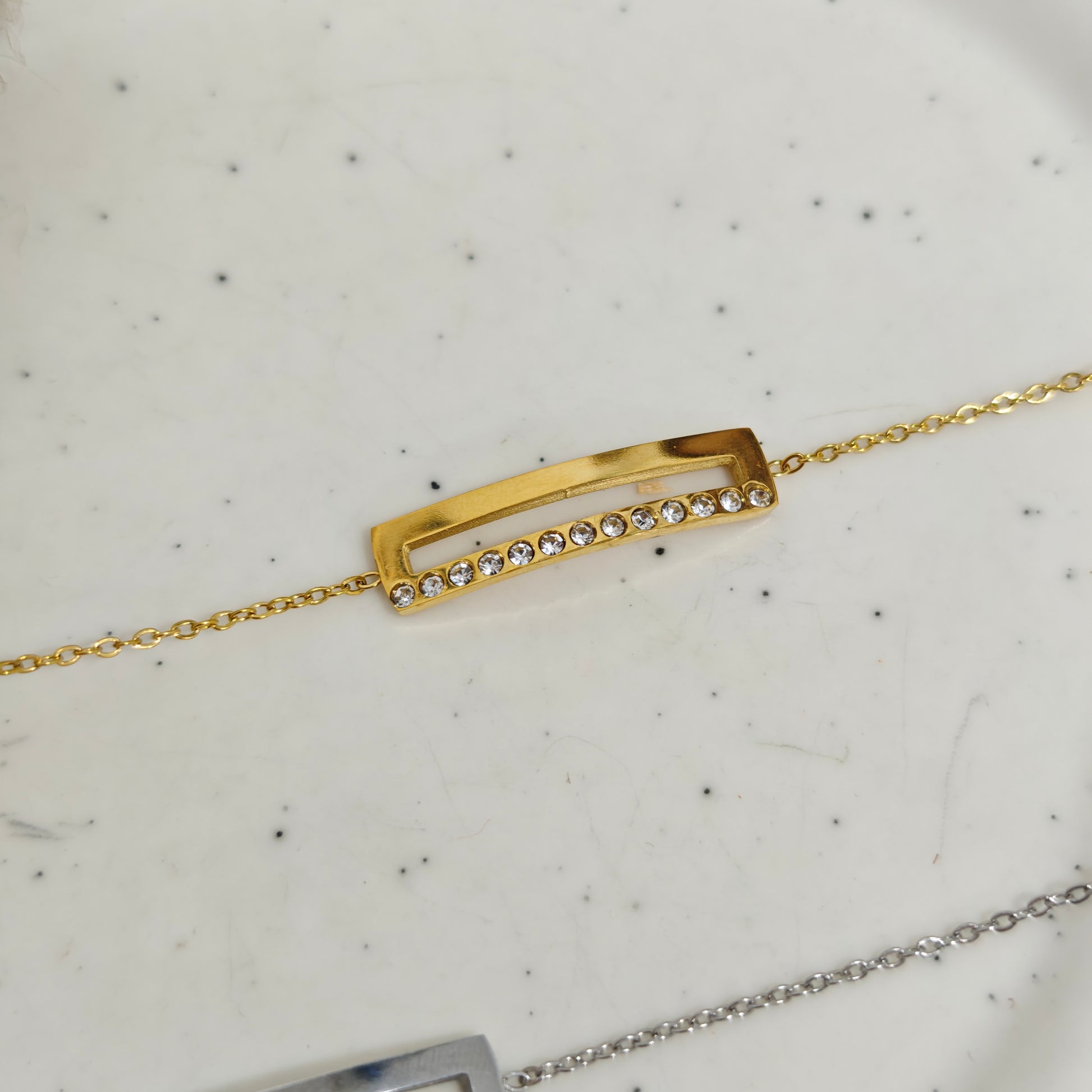 La Pulsera Lúmina destaca por su diseño rectangular limpio y moderno, adornado con una delicada línea de pequeños brillantes que aportan luz sutil y elegante.