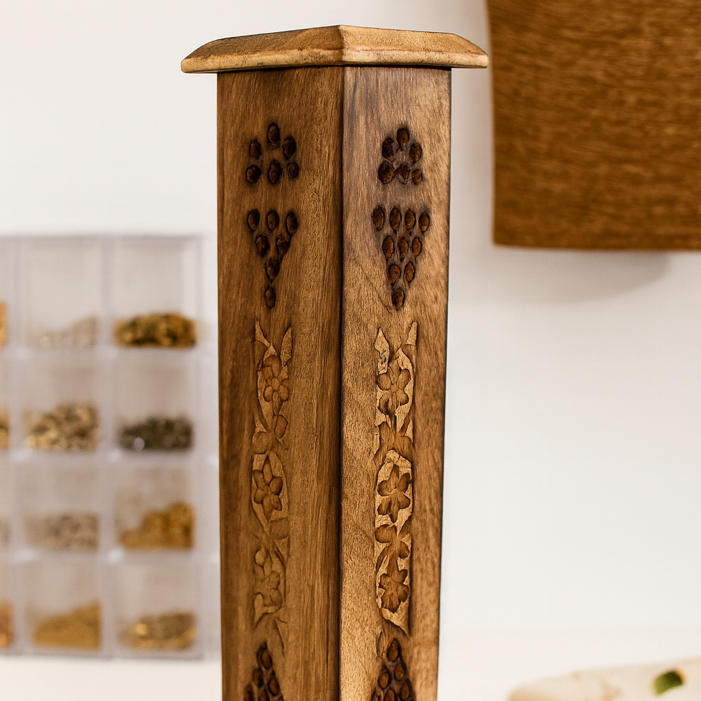 Torre porta incienso de madera tallada a mano, ideal para crear un ambiente cálido y relajante. Su diseño artesanal con grabados florales y detalles naturales permite que el humo del incienso se eleve suavemente, aportando un toque bohemio y elegante a cualquier rincón.