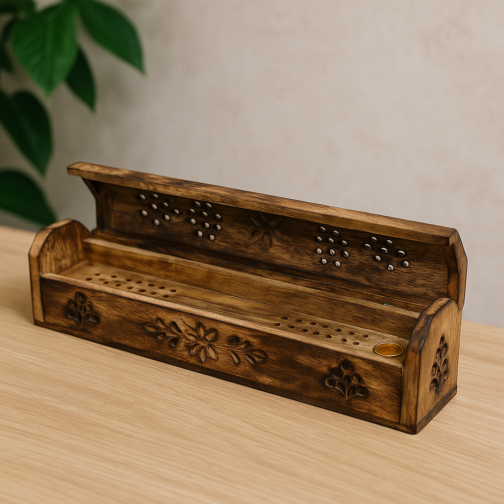 Perfecta para usar con varillas de incienso, protege las superficies y mantiene la ceniza contenida. Una pieza decorativa y funcional que combina la esencia natural de la madera con el bienestar del aroma.